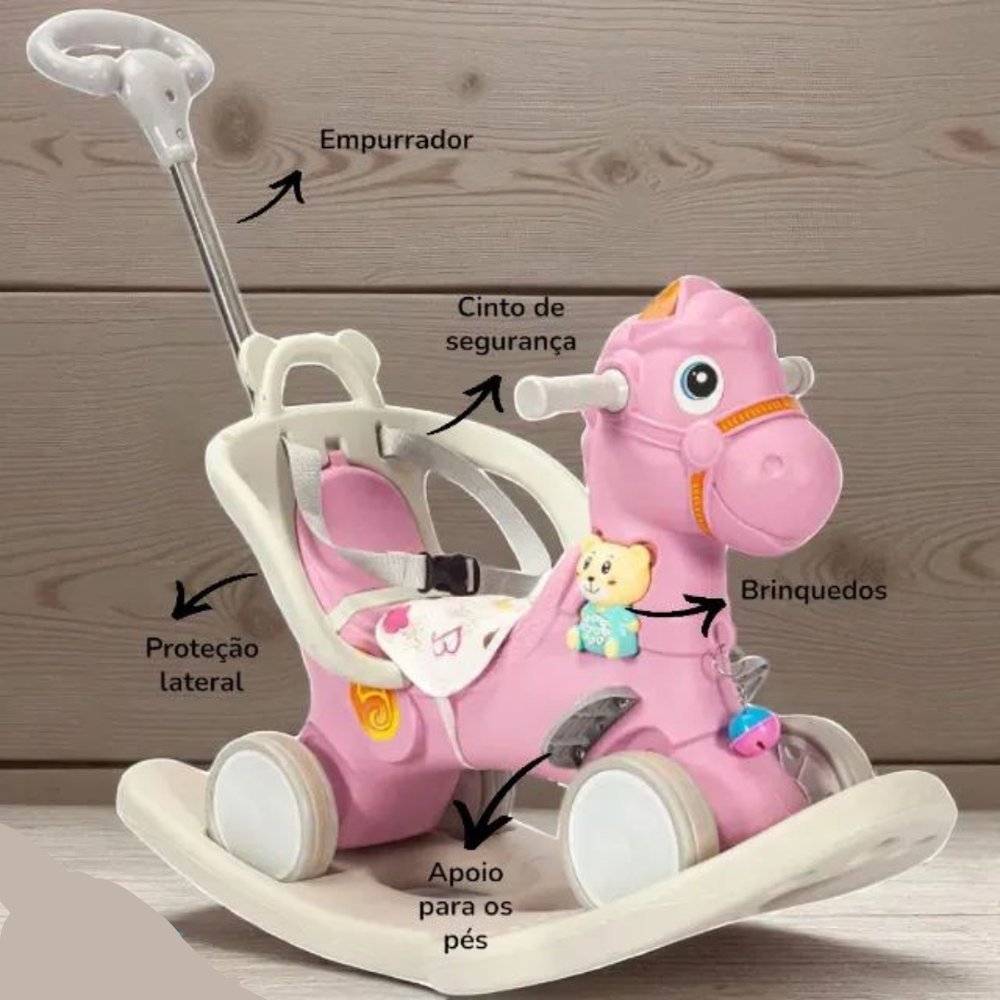 Cavalinho de Passeio e Balanço com Empurrador – Rosa